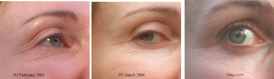 In comparing the progress pictures one of the lines that ran from the top of the lid down the side isn't there. The lid appears to have tightened up a lot. In the latest picture, looking down at the camera, the lines should be much more evident under the eye than when looking up as in first photo. The dynamic smile lines are smoothing out fast with the long one that ran underneath my eye almost gone!